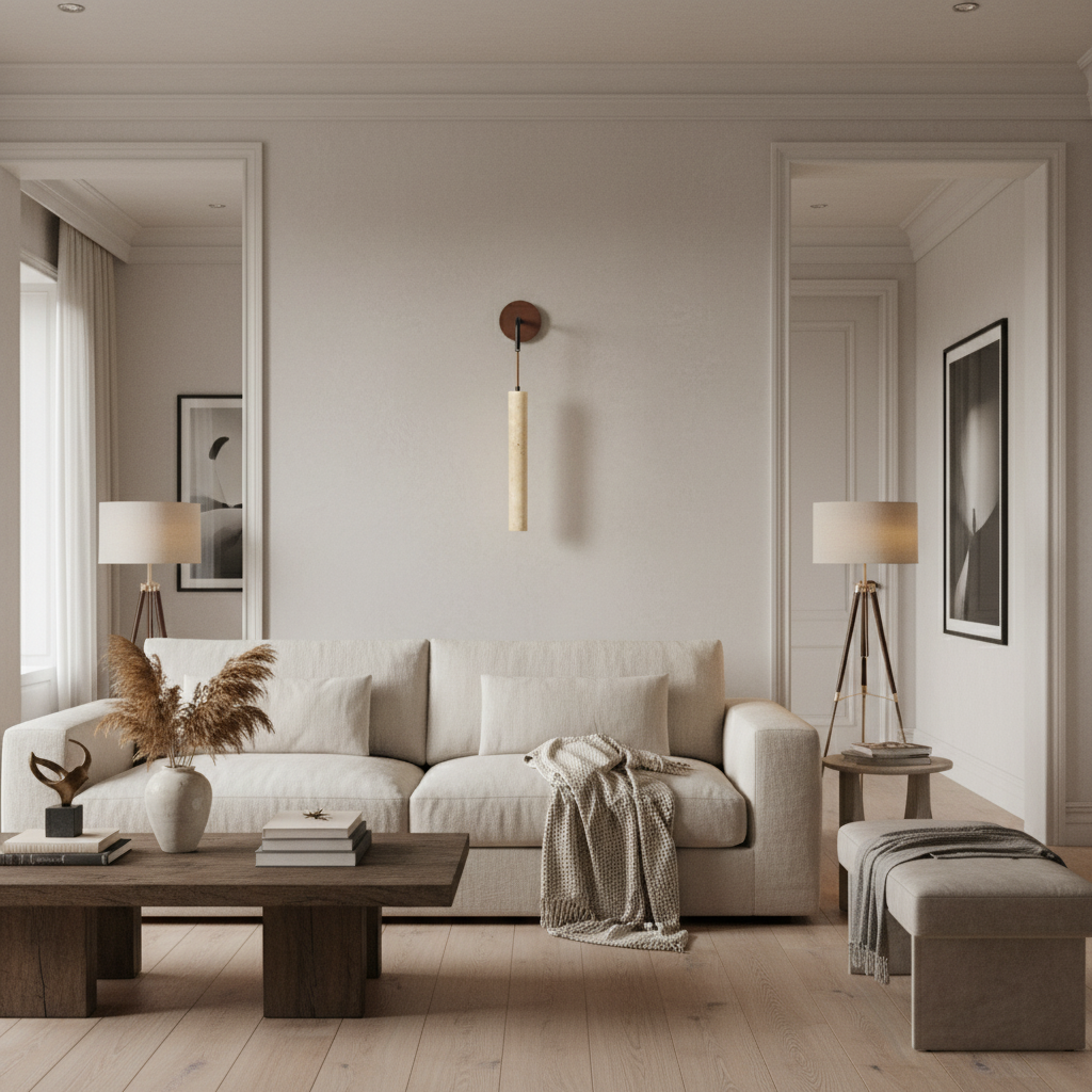 Materials: Solid Travertine Backplate, Natural Wood Accent, Hand-Finished Ceramic Shade