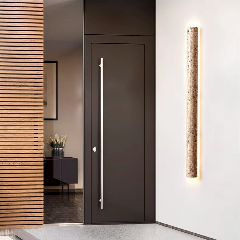 A cylindrical wooden log with a rough, textured surface stands vertically against a plain light gray background, echoing the natural travertine finish of the Morsale Solterra Travertine Indoor/Outdoor Wall Light.
