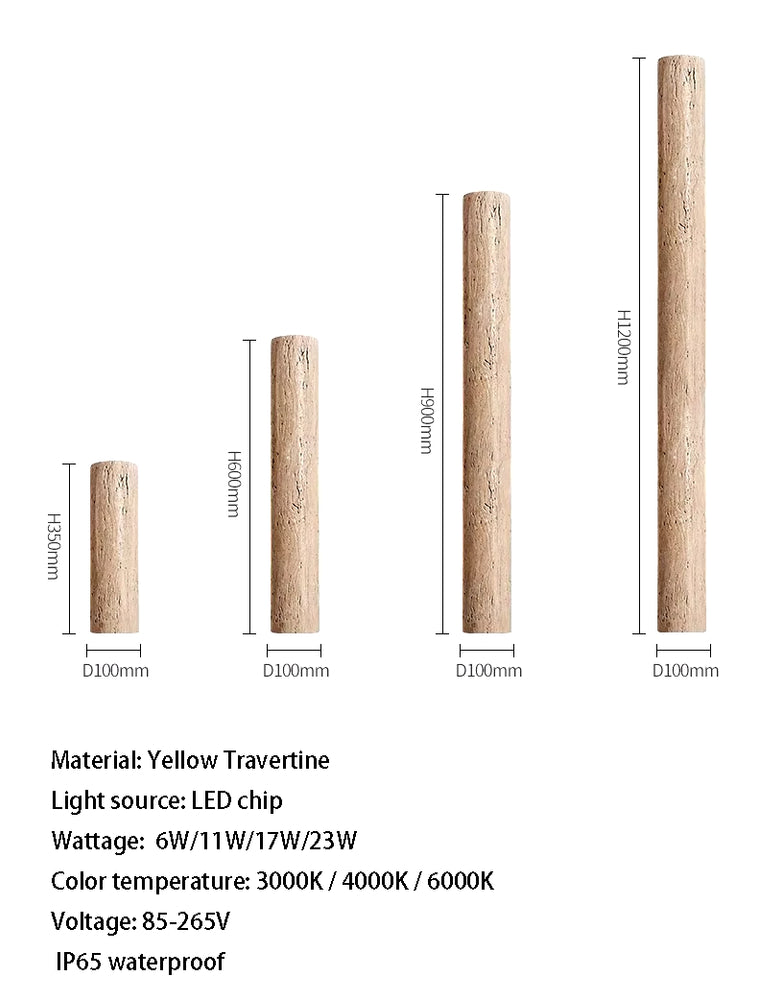 Four Morsale Solterra Travertine Indoor/Outdoor Wall Lights, each cylindrical with a 100mm diameter and heights of 150mm, 400mm, 800mm, and 1200mm, are crafted from natural travertine; integrated LED specs and features are below.