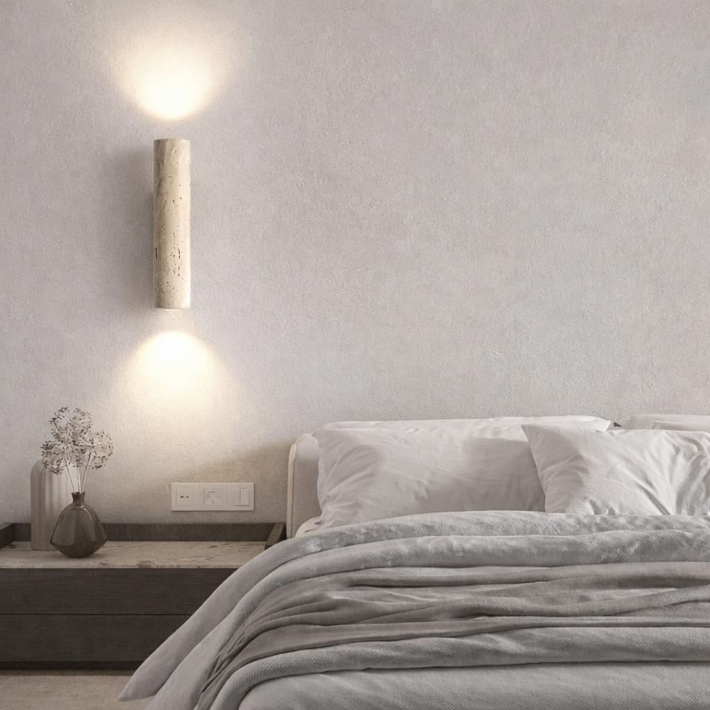 Defined by restraint and material purity, the Lunaro Wall Sconce introduces the quiet luxury of natural travertine into contemporary interiors. Carved from solid stone, each piece reveals distinctive striations and warm tonal variation—an organic signature formed over time and preserved in light.