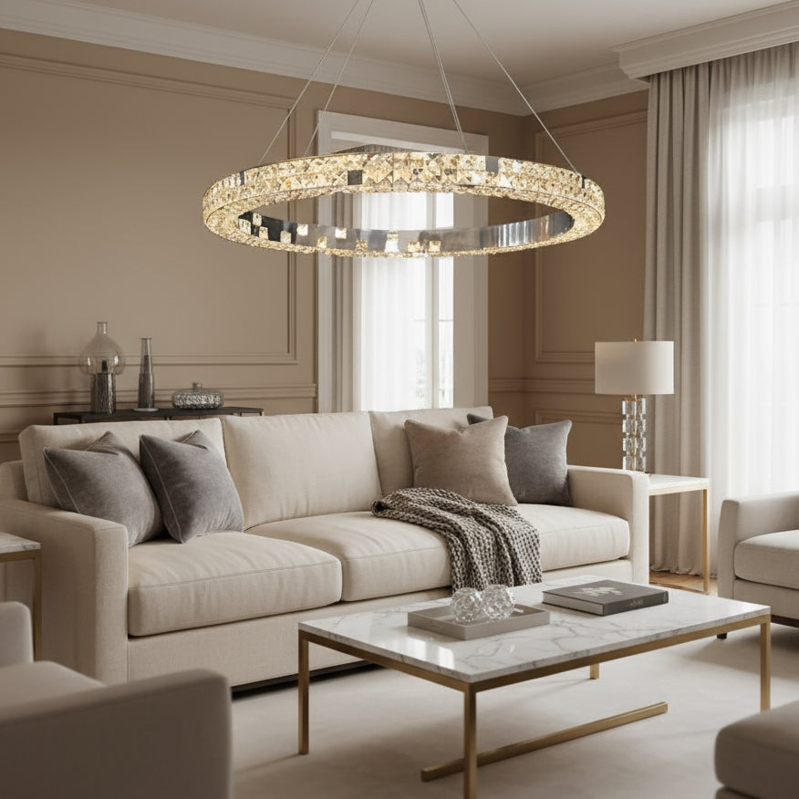 A modern living room with beige walls, a cream sectional with gray and beige pillows, a marble coffee table, and the Langley Crystal Ring Chandelier by Morsale.com with dimmable LED light hanging from the ceiling. Sunlight streams through tall windows.