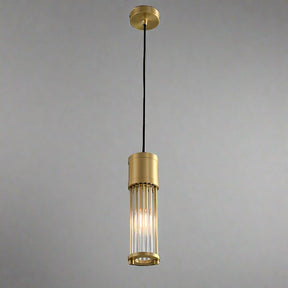 The Xihkonga Barnes Kitchen Island Pendant Light features a gold finish, cylindrical glass shade, and black cord. Ideal for kitchen islands, it emits a warm, inviting glow against a plain gray background.