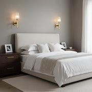 A modern bedroom with a beige upholstered bed, white bedding, and two dark wood nightstands holding framed photos is softly lit by Morsale Palermo Wall Sconces above. Gentle natural light streams through a sheer white curtain on the right.