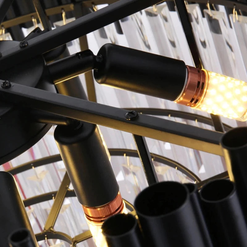 Close-up of the Vigo Crystal Ceiling Chandelier by Morsale.com, featuring black cylindrical rods and rows of clear glass tubes with warm lights, offering a striking and luxurious modern lighting fixture.