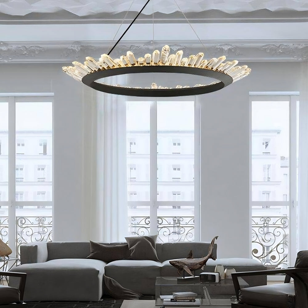 Close-up of several handmade crystals standing upright in a circle on a brushed black metallic base, illuminated by warm light—showcasing the Orion Contemporary Chandelier from Morsale.com.