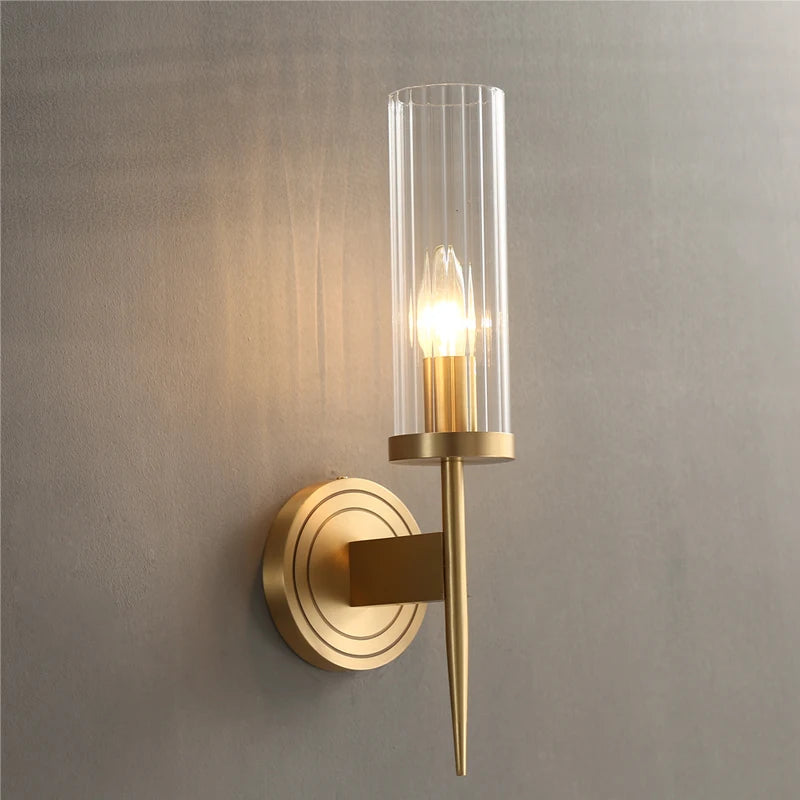 The Palermo Copper & Glass Wall Sconce by Morsale features two cylindrical glass shades and a gold metal base, offering sophisticated ambient lighting for any space.