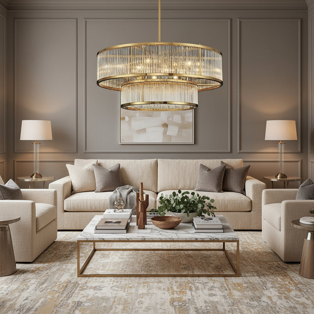 A modern, elegant living room featuring a large gray sectional sofa with mustard-colored cushions, a black coffee table adorned with decorative items, and a striking Gerano Modern Chandelier by Bigman illuminated by LED bulbs. The dark blue paneled walls and a green plant create a sophisticated ambiance.