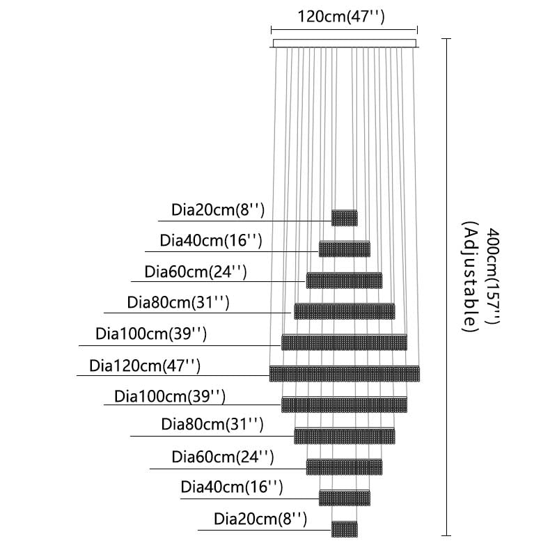 A diagram of the Alleri Crystal Foyer Chandelier by Morsale.com reveals a cascading design with multiple circular tiers and sparkling crystal shades. The diameters of these tiers range from 20cm (8