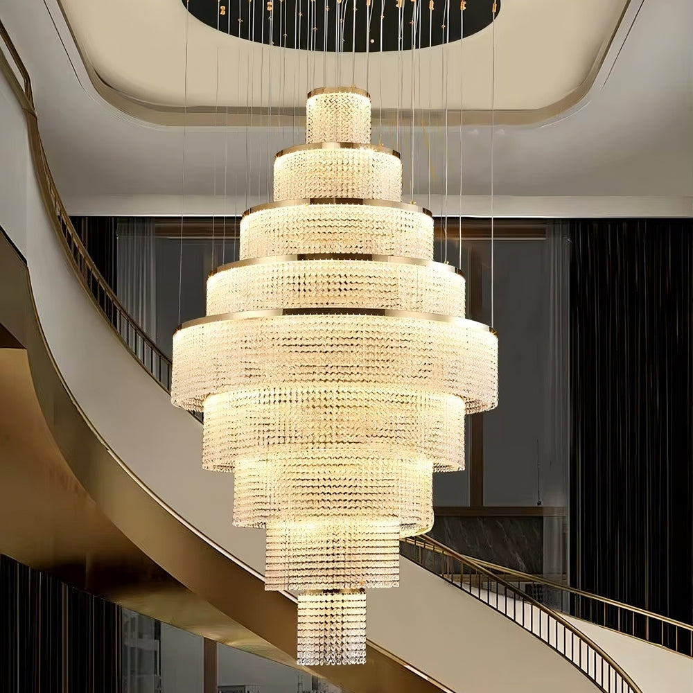 An opulent Alleri Crystal Foyer Chandelier in gold from Morsale.com graces a high ceiling with its modern circular mount. The grand multi-tiered chandelier, adorned with crystal shades and a cascading design, casts a radiant glow over the sweeping spiral staircase below. Its illumination starkly contrasts against dark walls and large windows, enhancing the luxurious interior setting and showcasing exquisite modern lighting.