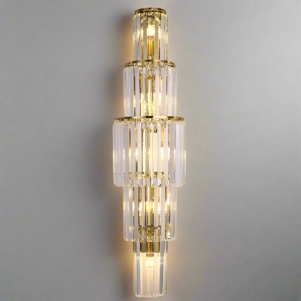 The Gio Crystal Wall Sconce by Morsale.com features tiered, gold-framed clear crystal rods in a symmetrical pattern. Dimmable LED bulbs emit a warm glow through the glass, enhancing any neutral wall with elegance.