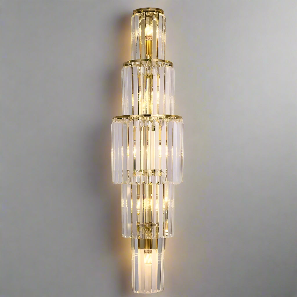 The Gio Crystal Sconce from Morsale.com features cascading gold and clear glass tiers, casting a warm glow against white marble walls and adding elegance and luxury to any space.