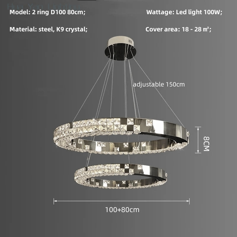 Bold, sophisticated lighting statement perfect for contemporary interiors. Featuring two gleaming crystal-encrusted rings in a steel frame, this chandelier brings both elegance and architectural style to any room. Ideal for high ceilings and open spaces, it offers an adjustable hanging height and built-in LED lighting for energy-efficient brilliance.