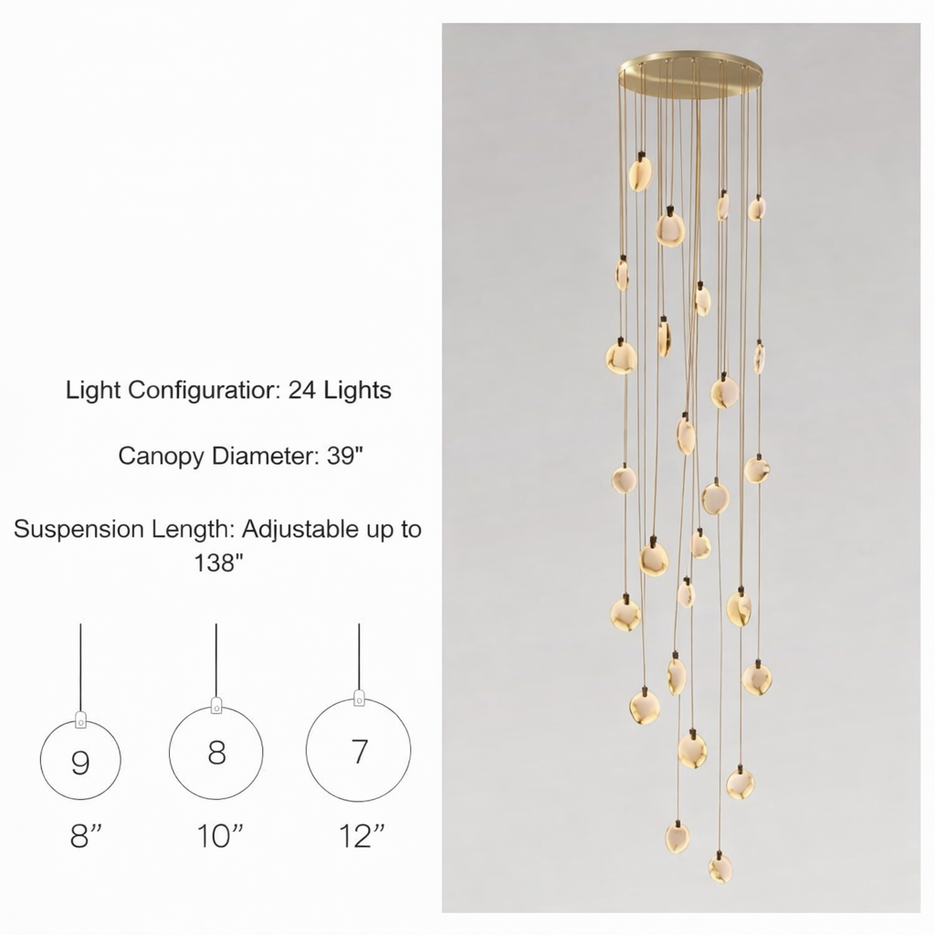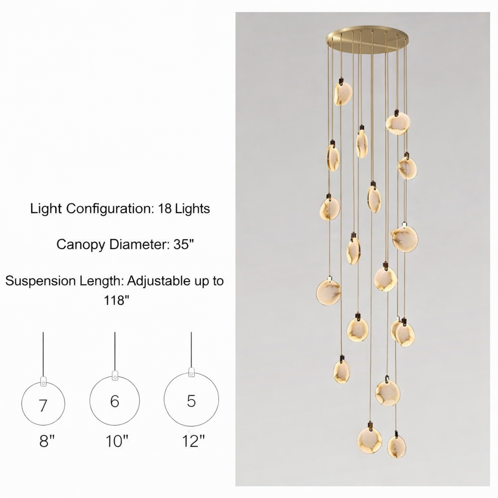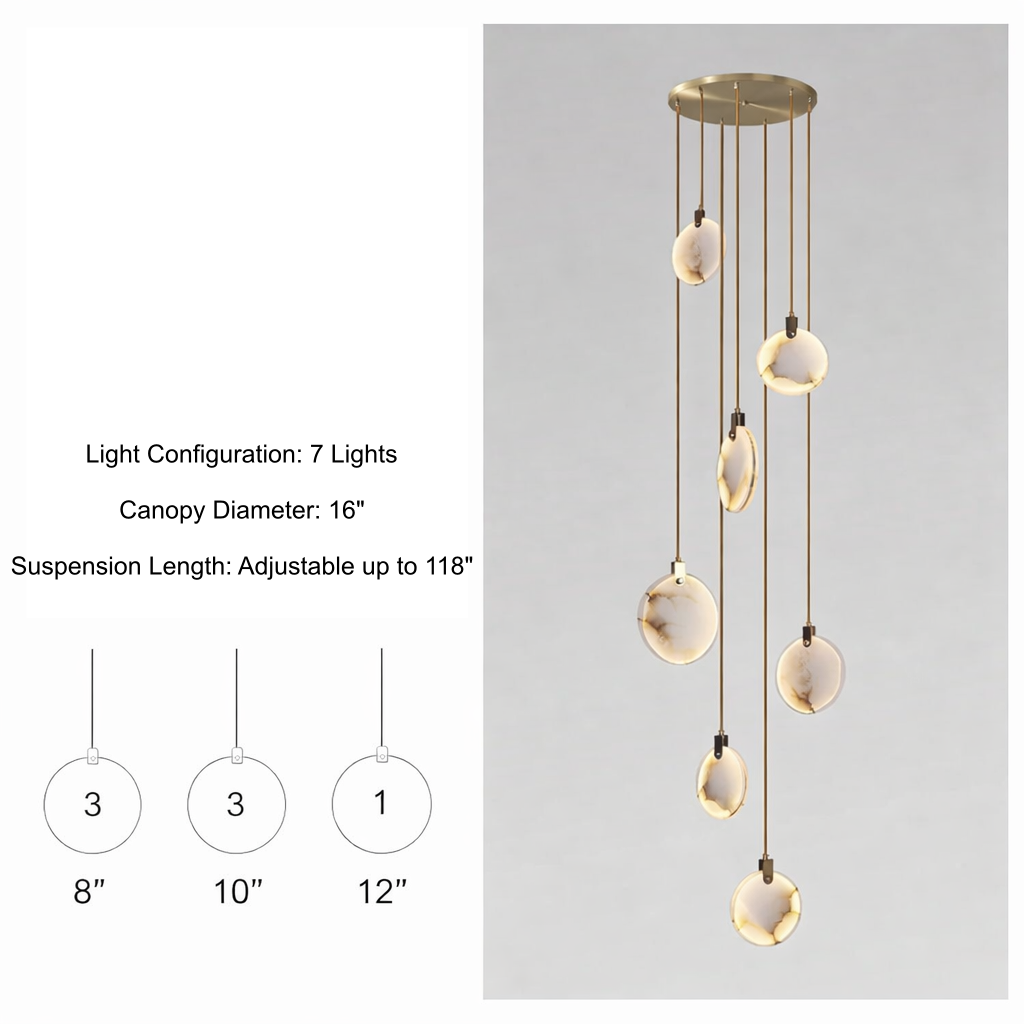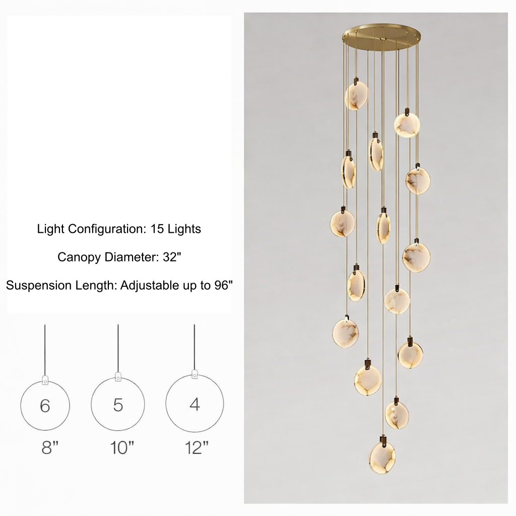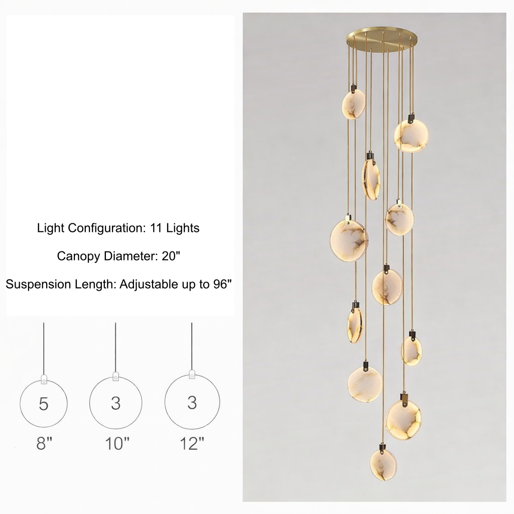 Regular price $1,385.00The Moonshade Marble Disc Chandelier is a sculptural lighting statement crafted from natural marble imported from Spain. Designed to elevate vertical architectural spaces, this cascading disc chandelier transforms staircases, grand foyers, and double-height ceilings into illuminated works of art.