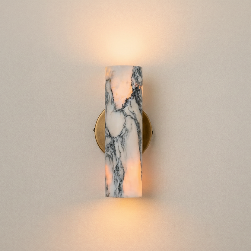 The Moonshade™ Marble Wall Sconce by Morsale.com features a cylindrical marble-patterned shade that casts a warm glow above and below, elegantly illuminating light-colored walls with the look of natural marble.