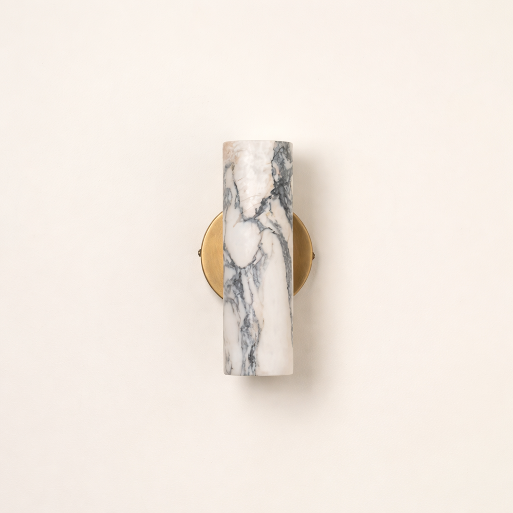 The Moonshade™ Marble Wall Sconce by Morsale.com features a cylindrical white marble shade with gray veining on a round brass base, offering elegant, sculptural lighting against an off-white background.