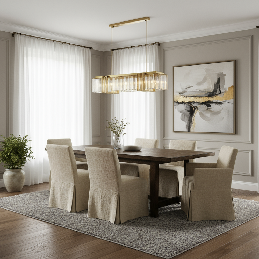 Add some glamor to your dining room with this exquisite chandelier. A dazzling crystal chandelier in a brushed gold finish is the perfect way to light up your dining room. This sumptuous chandelier will make a dramatic statement in any room. With its luxurious design, this chandelier is sure to impress your guests.