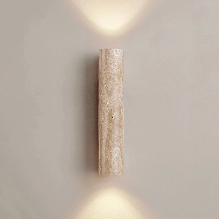 The Lunaro Travertine Wall Sconce by YEBMLP features a cylindrical natural travertine design that casts soft, warm up-and-down light on neutral walls—ideal for minimalist spaces.