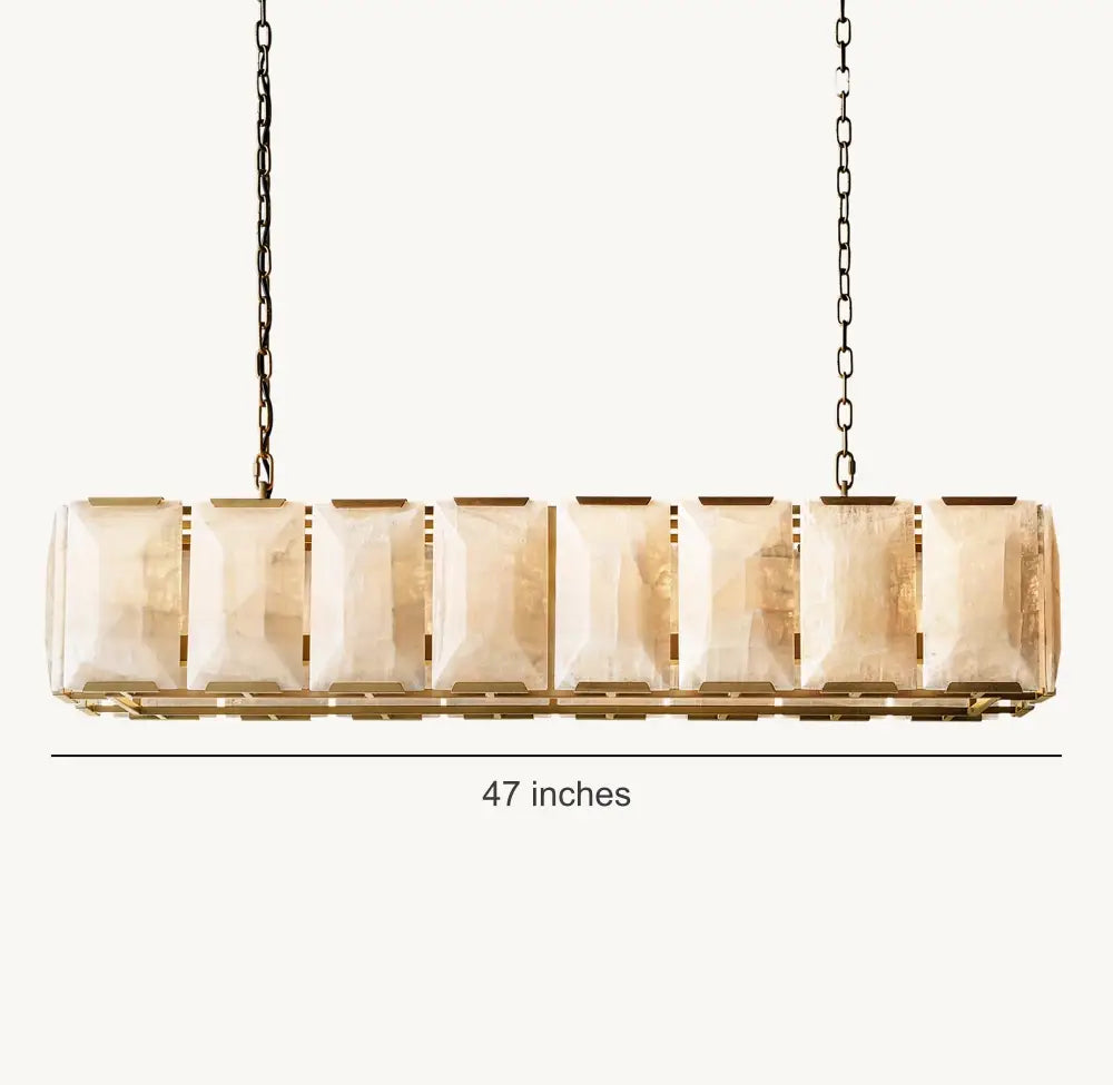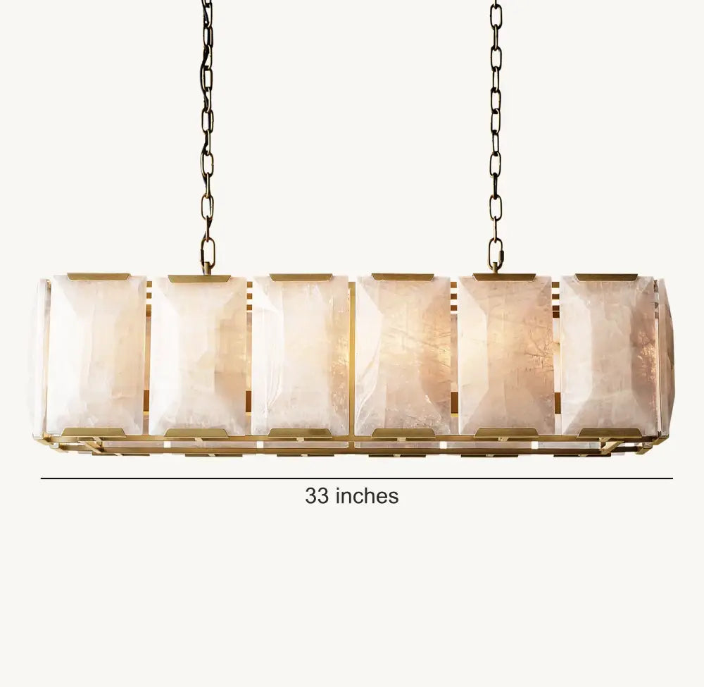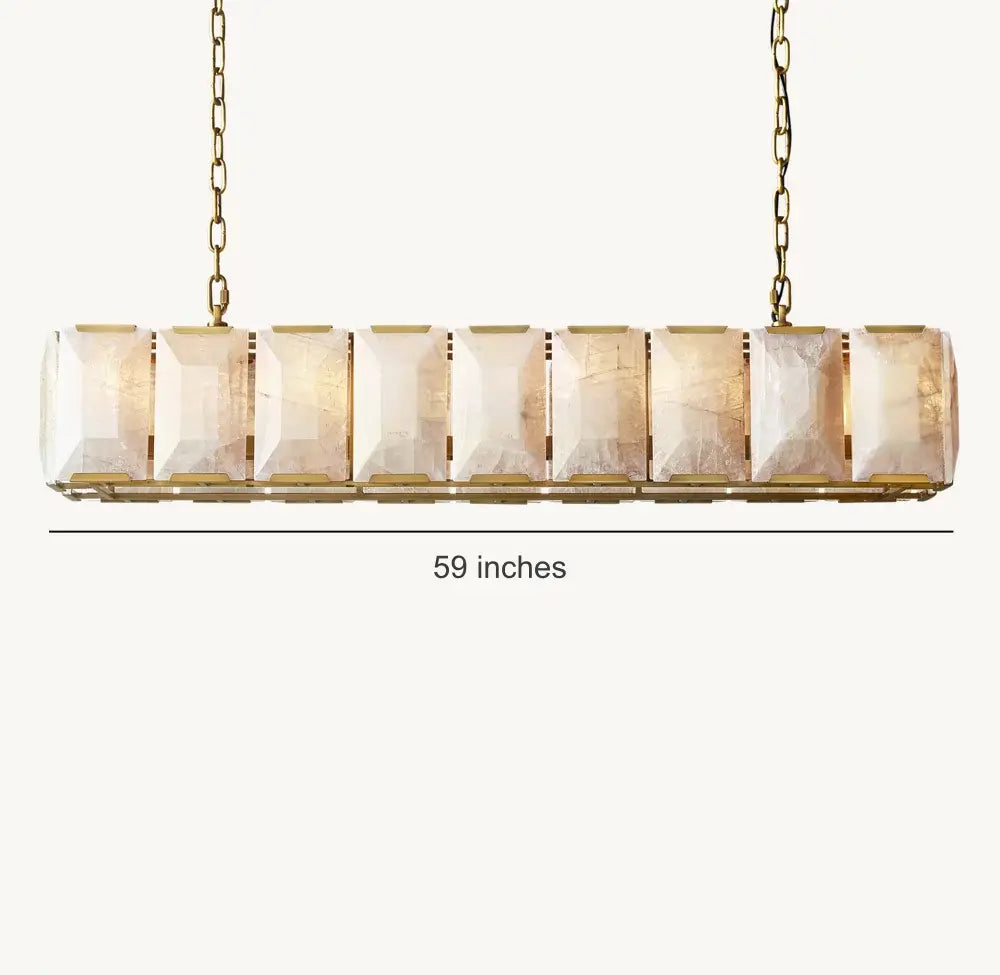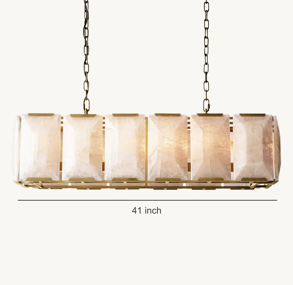 The Brookhill Calcite Dining Chandelier by Morsale.com features a rectangular solid brass frame with nine faceted crystal panels, suspended from the ceiling by two metal chains and casting a soft, warm light against a plain gray background.