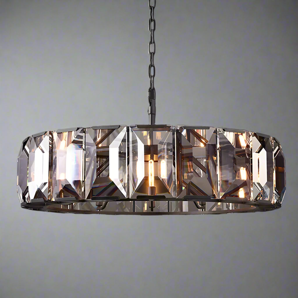A modern living room with beige sofas, a wooden coffee table, and the Brookhill Crystal Chandelier by Morsale.com. A large rose artwork hangs between mirrors, while neutral tones and luxury lighting create a cozy atmosphere.