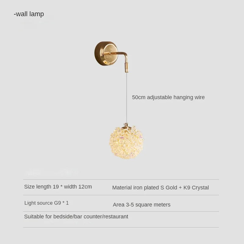 Close-up of the El Sol Crystal Wall Sconce by Morsale, featuring clear and a few purple crystal-like beads densely arranged around a gold base.