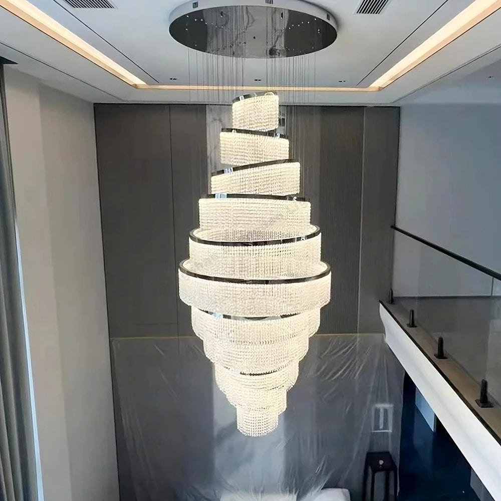 The Alleri Crystal Foyer Chandelier is a stunning statement piece designed to enhance the elegance of foyers, staircases, and grand entryways. Featuring a modern, long crystal design, this luxury semiflush mount chandelier is crafted from premium stainless steel and high-quality crystals, creating a dazzling effect. The polished finish adds a sleek touch, while its certified safety and quality standards ensure long-lasting performance.
