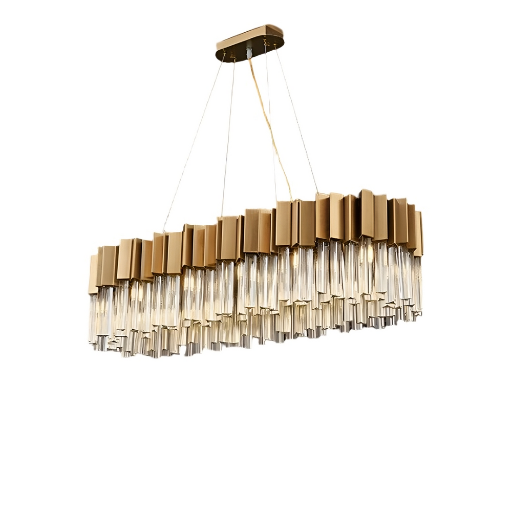 The Milano Dining Chandelier redefines modern grandeur with sculptural precision and luminous clarity. Handcrafted from brushed stainless steel in a burnished gold finish, its streamlined frame suspends tiers of hand-cut crystal rods that shimmer with prismatic brilliance. Each crystal refracts the light with sculptural elegance, transforming everyday dining into a ritual of quiet luxury. Adjustable suspension allows for tailored installation, while dimmable LED illumination sets the perfect ambiance for both intimate dinners and grand gatherings.