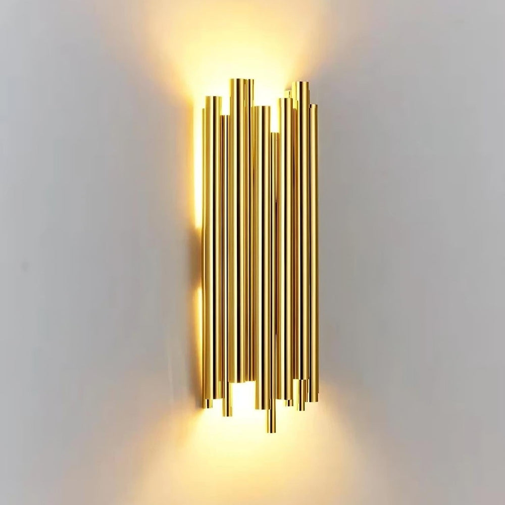 The Vigo Stainless Steel Wall Sconce from Morsale.com features multiple vertical gold rods of varying lengths, arranged closely together against a plain beige background, showcasing a striking minimalist design.