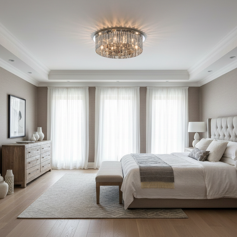 Gio Crystal Flush Mount Chandelier with shimmering crystals, enhancing modern interior decor as a stylish flush mount chandelier.