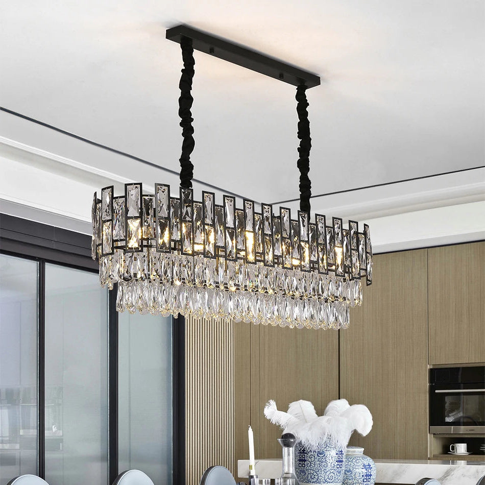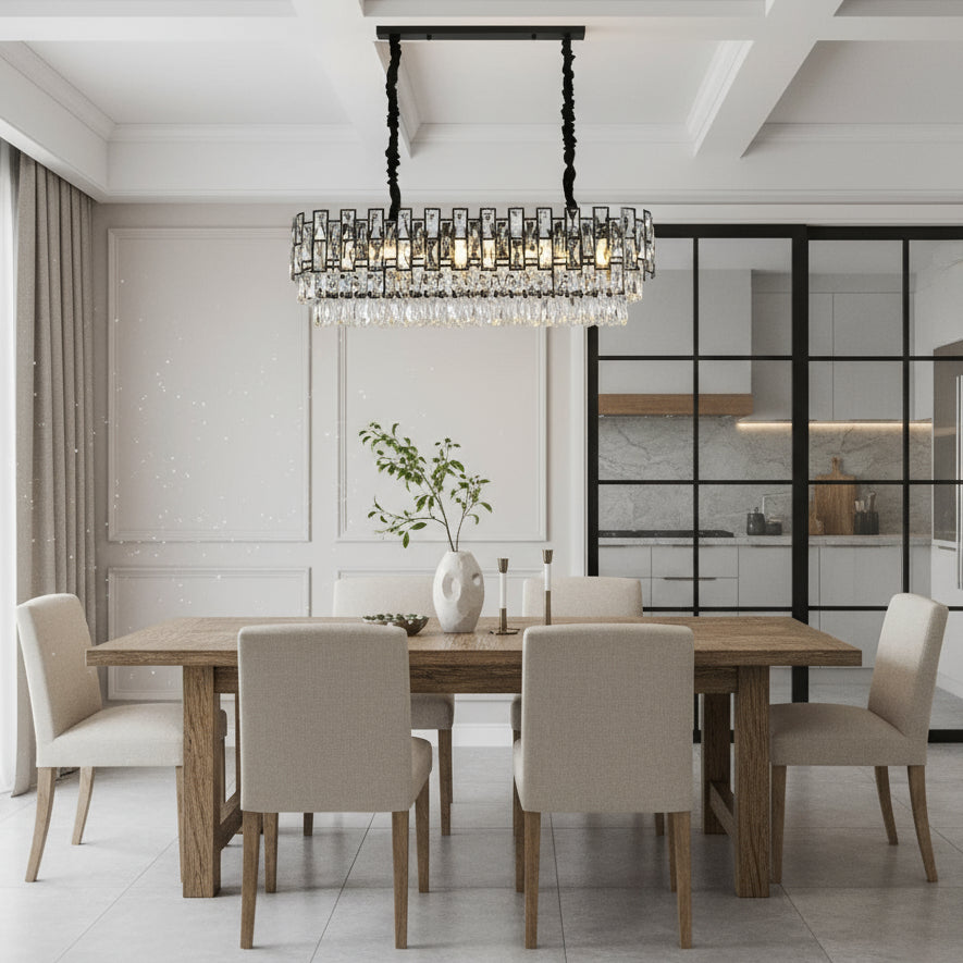 The Molini Dining Room Chandelier by Morsale.com, a rectangular crystal fixture with black metal framing, hangs above a modern kitchen and dining area with light wood cabinets, blue-and-white vases, and a white feather centerpiece.