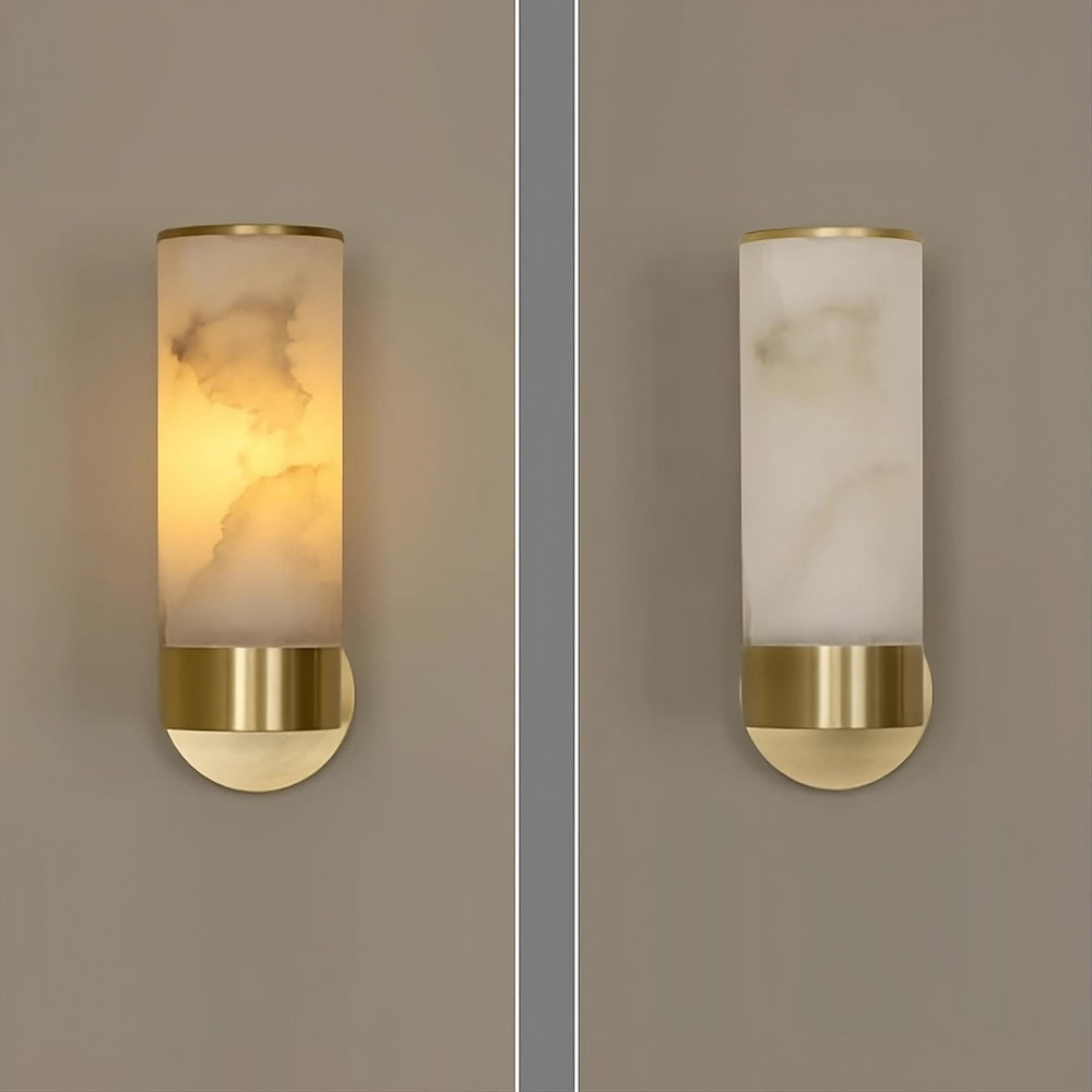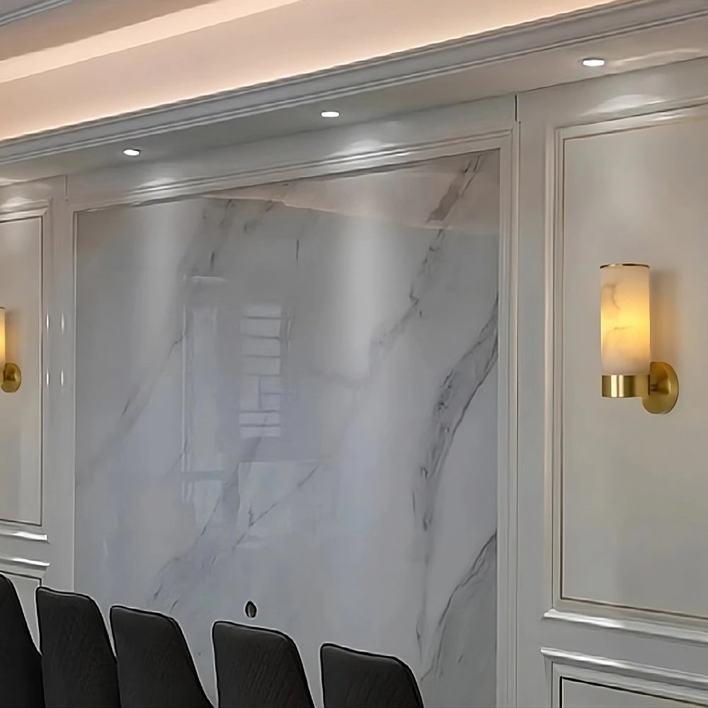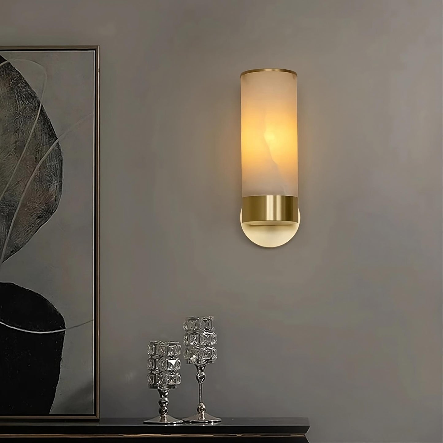 The Sierra Marble Wall Sconce by Morsale.com features a cylindrical frosted glass shade and brass accents, mounted on a light gray wall. It casts a soft, warm glow, adding elegance to modern interiors.