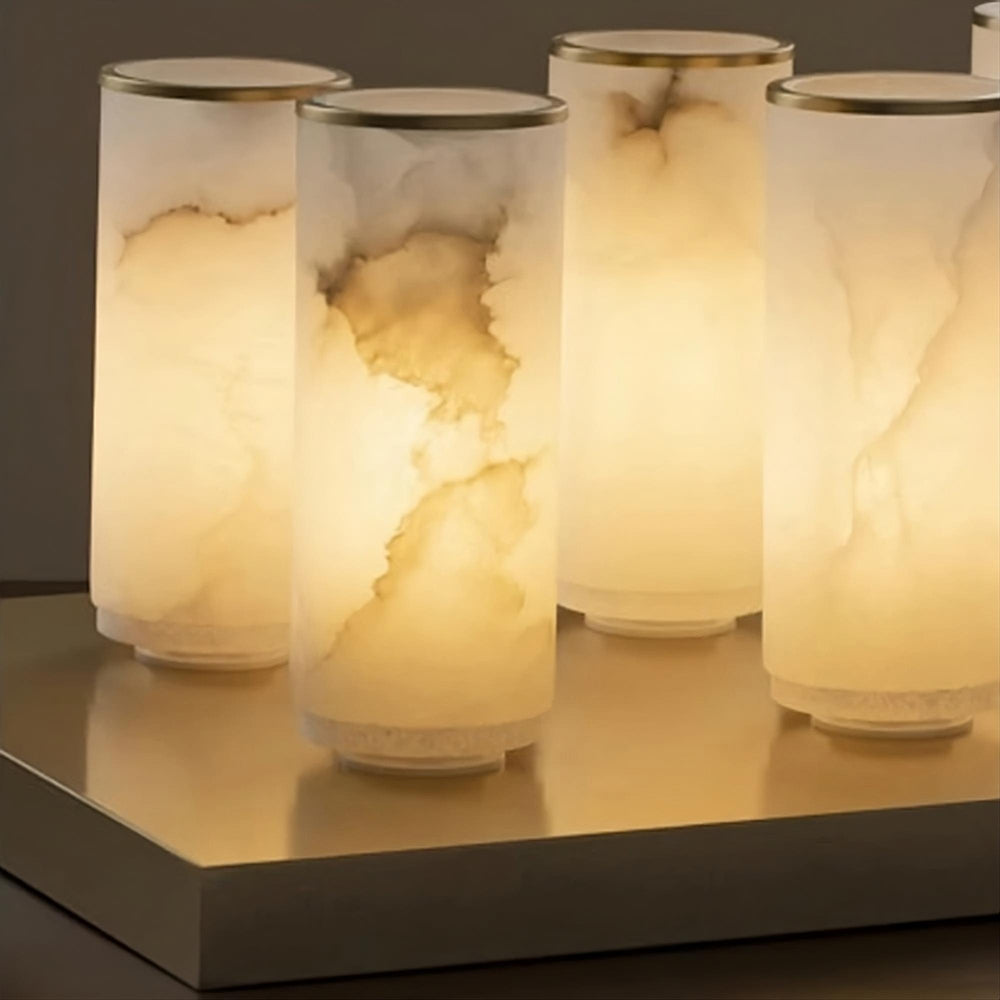 Two Sierra Natural Marble Wall Sconces from Morsale.com, each with a gold base, adorn a beige wall—ideal for modern spaces. The left sconce emits a warm glow, while the right displays its elegant marble pattern.